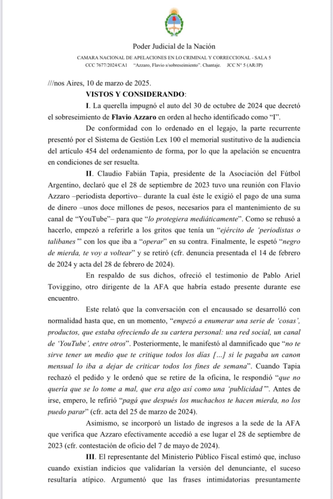 Por las declaraciones vertidas en el documento oficial, Azzaro le pidió al Chiqui un total de 12 millones de pesos para sostener su canal de YouTube a cambio de ponderar la labor de la máxima autoridad de la Asociación del Fútbol Argentino.