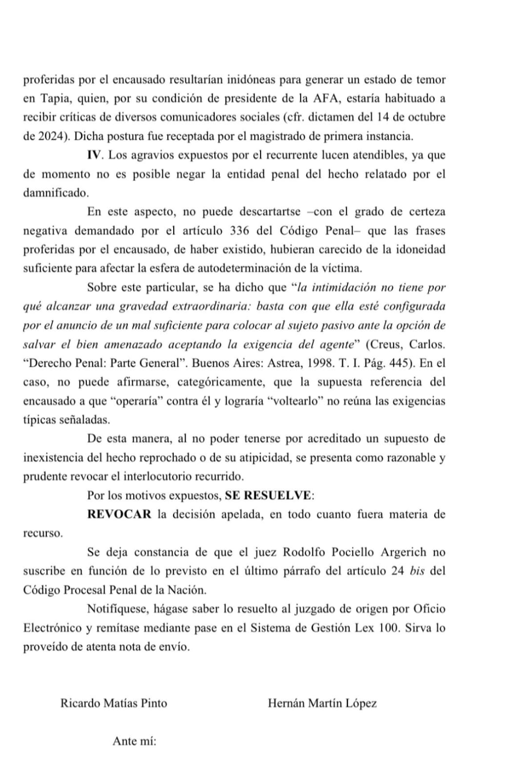 Pablo Toviggino, tesorero de AFA, publicó este martes un comunicado judicial por una causa caratulada como chantaje por parte del periodista, Flavio Azzaro, sobre Claudio Tapia a quien le ofrecía protección mediática a cambio de dinero.