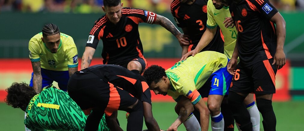 Un fuerte choque de cabezas entre Alisson y Davinson Sánchez sacó a ambos del partido que Brasil y Colombia disputan en Brasilia.