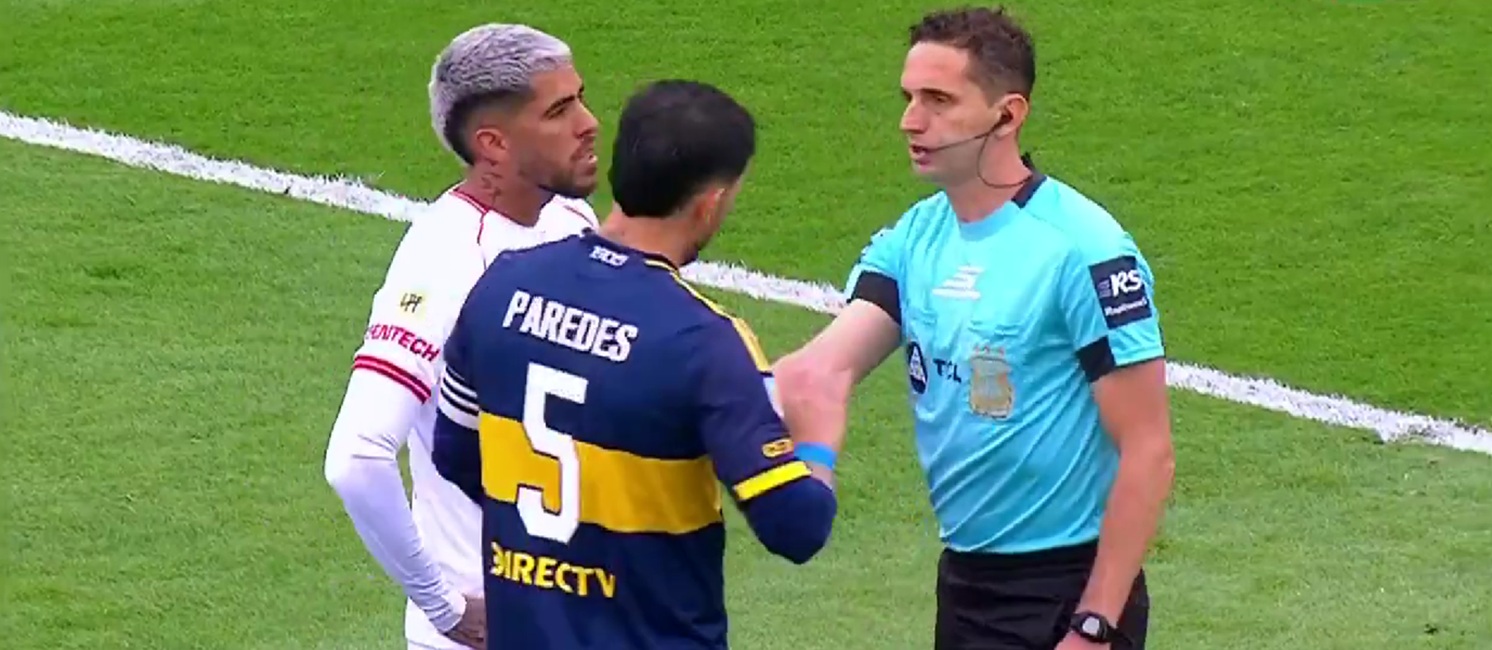 La revisión se imponía por estar la pelota en juego, era roja, y el reclamo de Boca generó un encontronazo entre Leandro Paredes e Iván Tapia, quienes fueron amonestados.