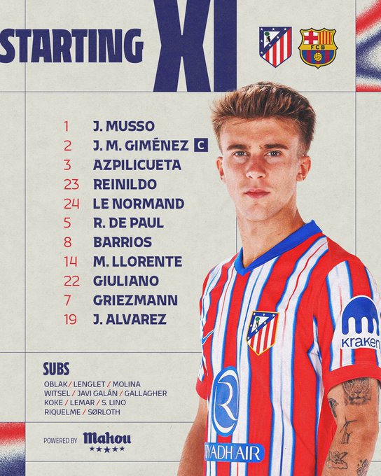 Atlético de Madrid irá con Juan Musso, Josema Giménez, Azpilicueta, Reinildo, Le Normand, Rodrigo De Paul, Barrios, Marcos Llorente, Giuliano Simeone, Griezmann y Julián Álvarez.