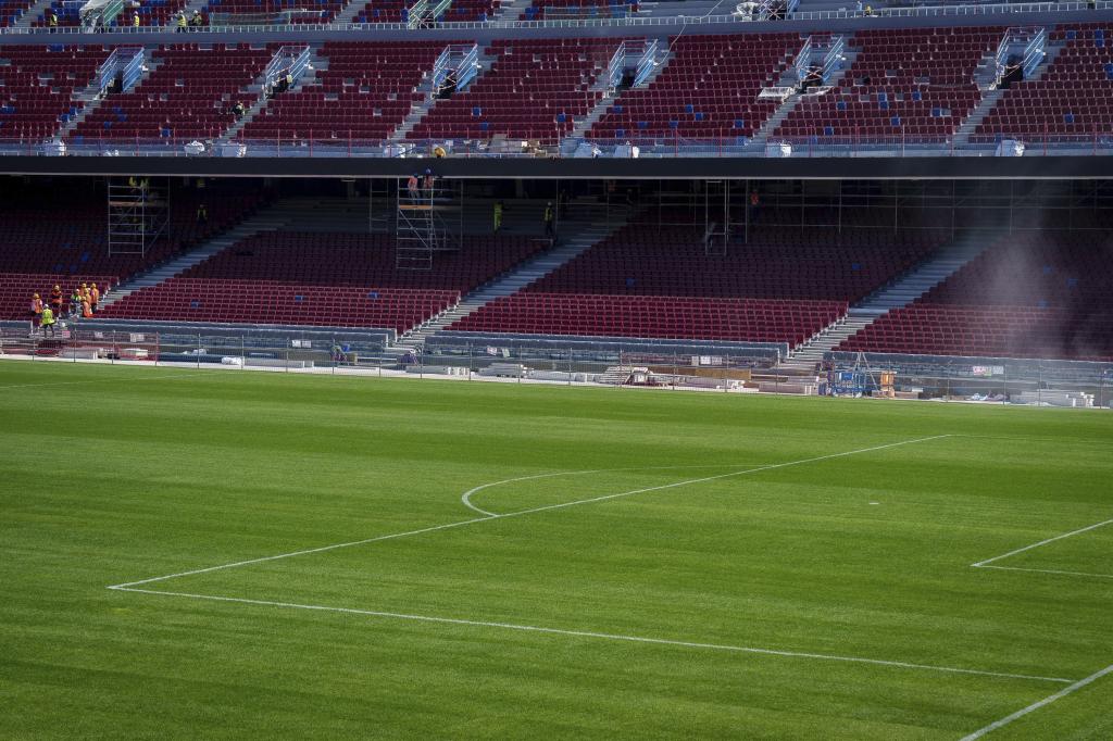 La estrucutra de la tercera bandeja del Camp Nou está en proceso mientras todo se prueba para soñar con la vuelta al reducto culé. Al campo se lo ve impecable y cuidado y las tribunas continúan su rumbo hacia la definición total del estadio.