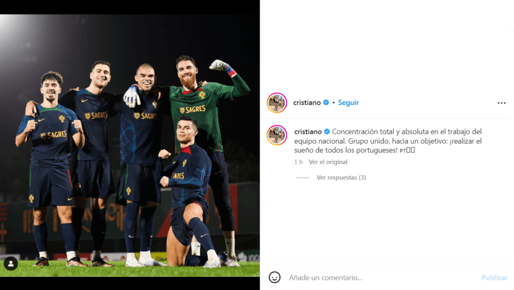 “Concentración total y absoluta en el trabajo del equipo nacional. Grupo unido hacia un objetivo: ¡Realizar el sueño de todos los portugueses” publicó Cristiano Ronaldo en su cuenta oficial de Instagram (@Cristiano) acompañando una foto donde se lo ve junto a sus compañeros Pepe, Diogo Dalot, Vitinha y José Sá.