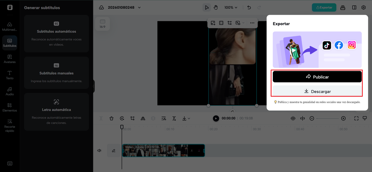 Cuando todo está en su lugar, puedes Exportar tu video en alta resolución. Luego eliges la resolución final, el formato y la tasa de fotogramas según tu plataforma, y tu contenido queda listo para distribuirse en múltiples canales.