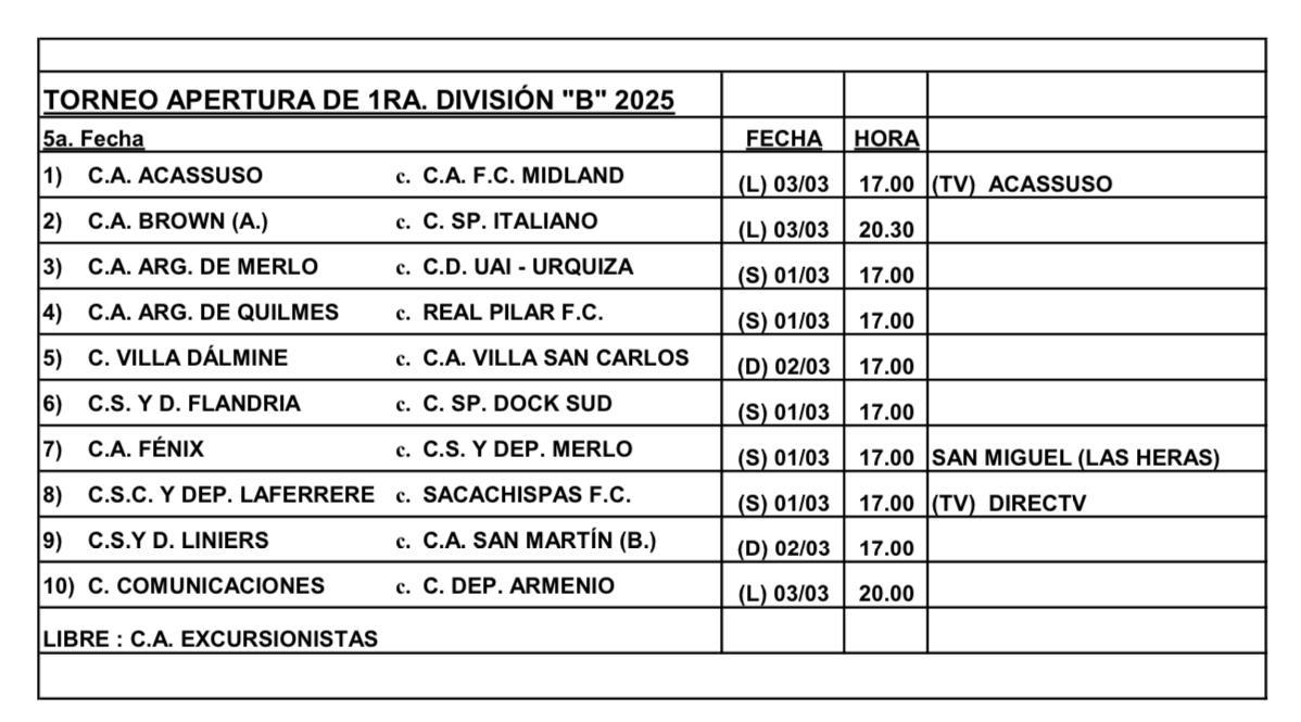 La Asociación del Fútbol Argentino oficializó la programación de la quinta fecha de la Primera B Metropolitana. Así se jugará una nueva fecha de la tercera división.