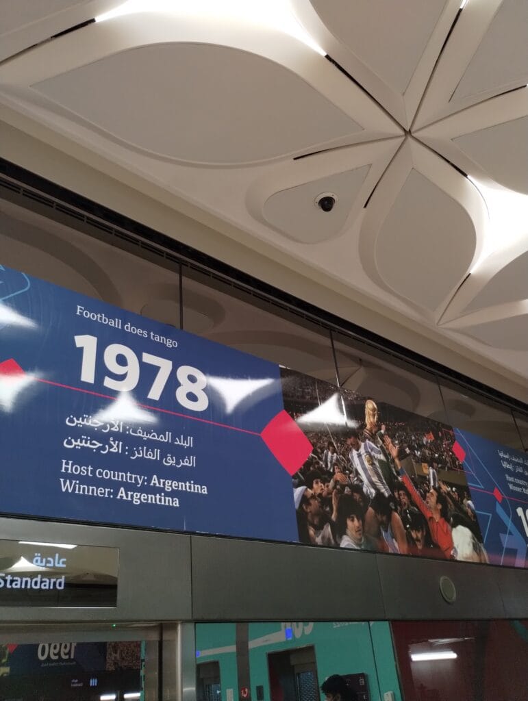 La estación del Metro del Aeropuerto Internacional de Hamad tiene una particularidad: repasa todos los campeones mundiales de la historia y obviamente recuerdan los trofeos de Argentina de 1978 y 1986 con imágenes de la Albiceleste.