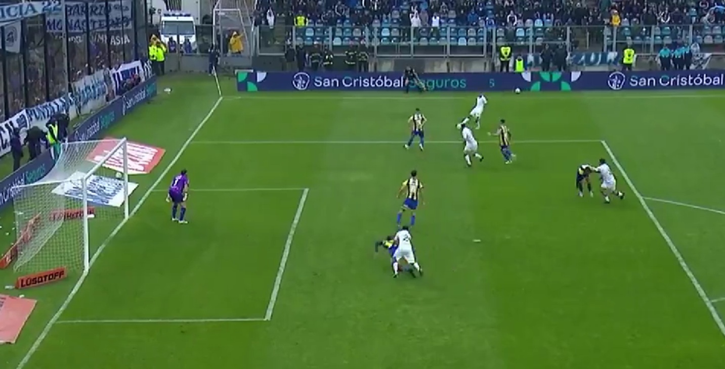 La jugada terminó anulada por Fernando Echenique, lejos de la acción, por empujón de Merlo en la disputa del balón.