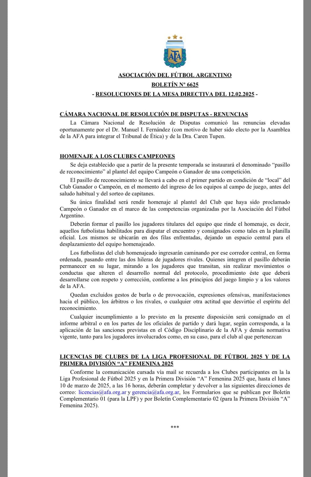 Detalles del Boletín Oficial de AFA sobre el pasillo de campeón