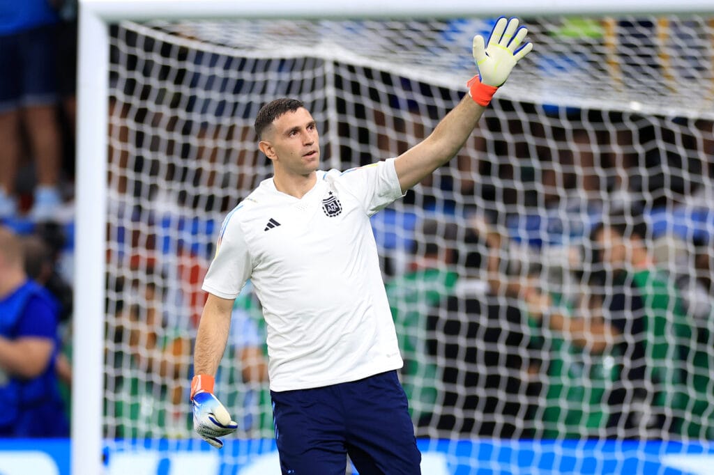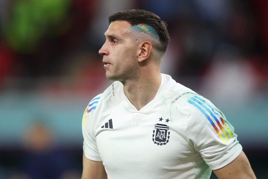 ¡Una locura más de Emiliano Martínez! El Dibu salió a la cancha con una bandera de Argentina teñida en el pelo e hizo delirar al público en el estadio Ahmad Bin Ali.