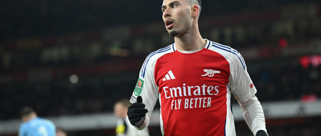 LONDON, ENGLAND - JANUARY 07: Gabriel Martinelli of Arsenal reacts after a missed chance during the Carabao Cup Semi Final First Leg match between Arsenal and Newcastle United at Emirates Stadium on January 07, 2025 in London, England. (Photo by Shaun Botterill/Getty Images)