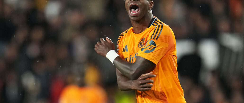 VALENCIA, SPAIN - JANUARY 03: Vinicius Junior of Real Madrid reacts during the LaLiga match between Valencia CF and Real Madrid CF at Estadio Mestalla on January 03, 2025 in Valencia, Spain. (Photo by Aitor Alcalde/Getty Images)