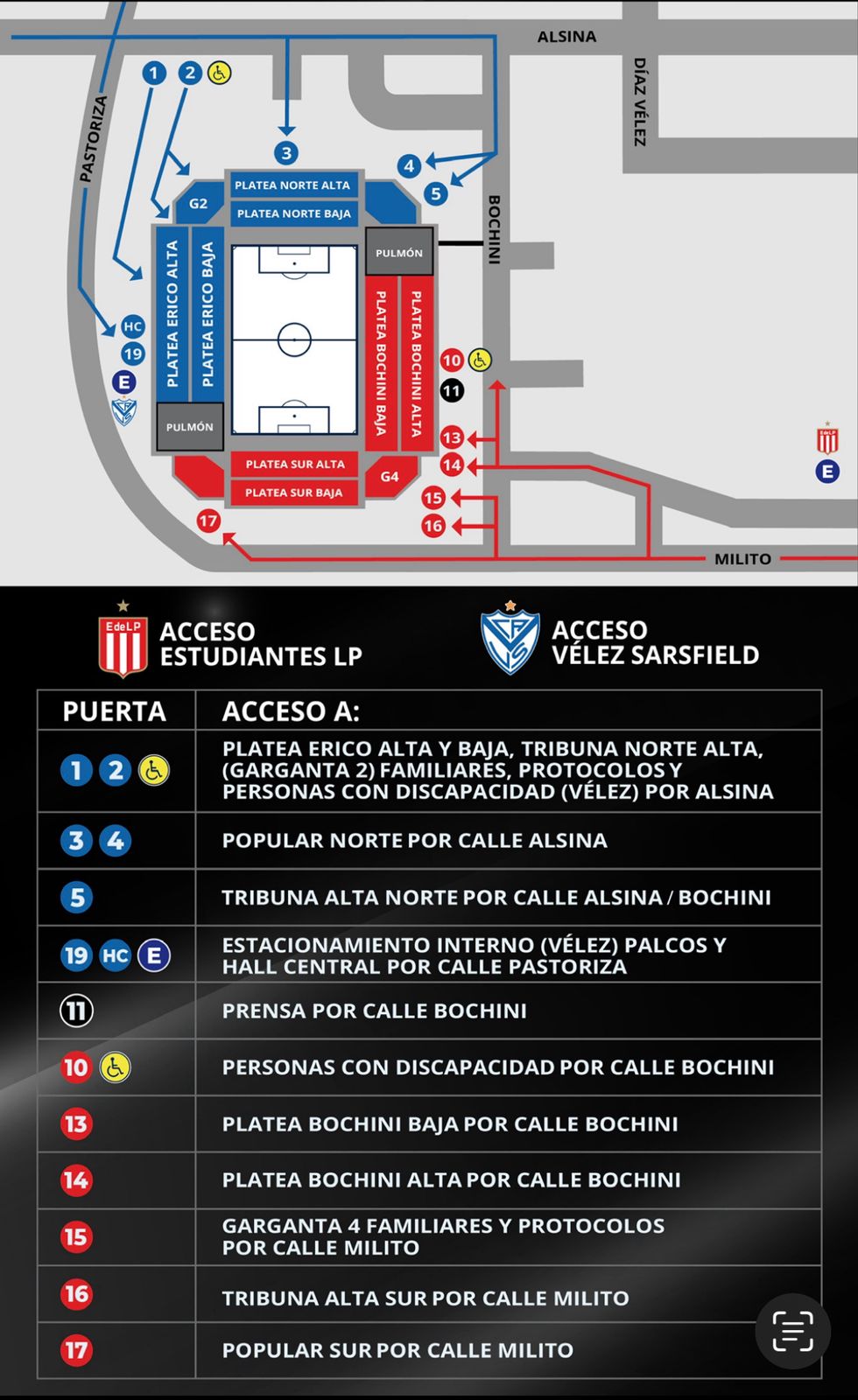 - Tribunas asignadas : Platea Erico Baja y Alta, Tribuna Popular Norte, Garganta 2, puertas habilitadas 01, 02, 03, 04, 05 y 19 .