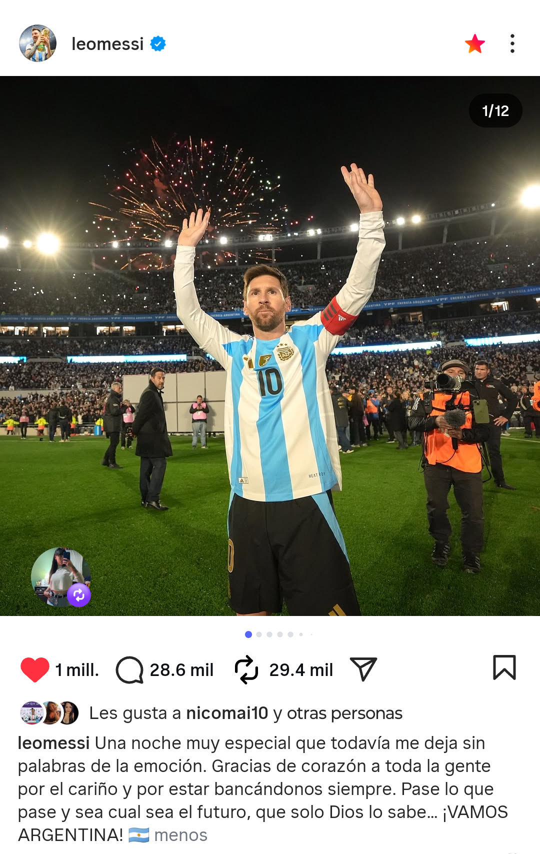 «Una noche muy especial que todavía me deja sin palabras de la emoción. Gracias de corazón a toda la gente por el cariño y por estar bancándonos siempre. Pase lo que pase y seal cual sea el futuro, que solo Dios lo sabe, ¡Vamos Argentina«, escribió el capitán de la Selección Argentina tras la victoria por 3-0 con doblete de ´Leo´.