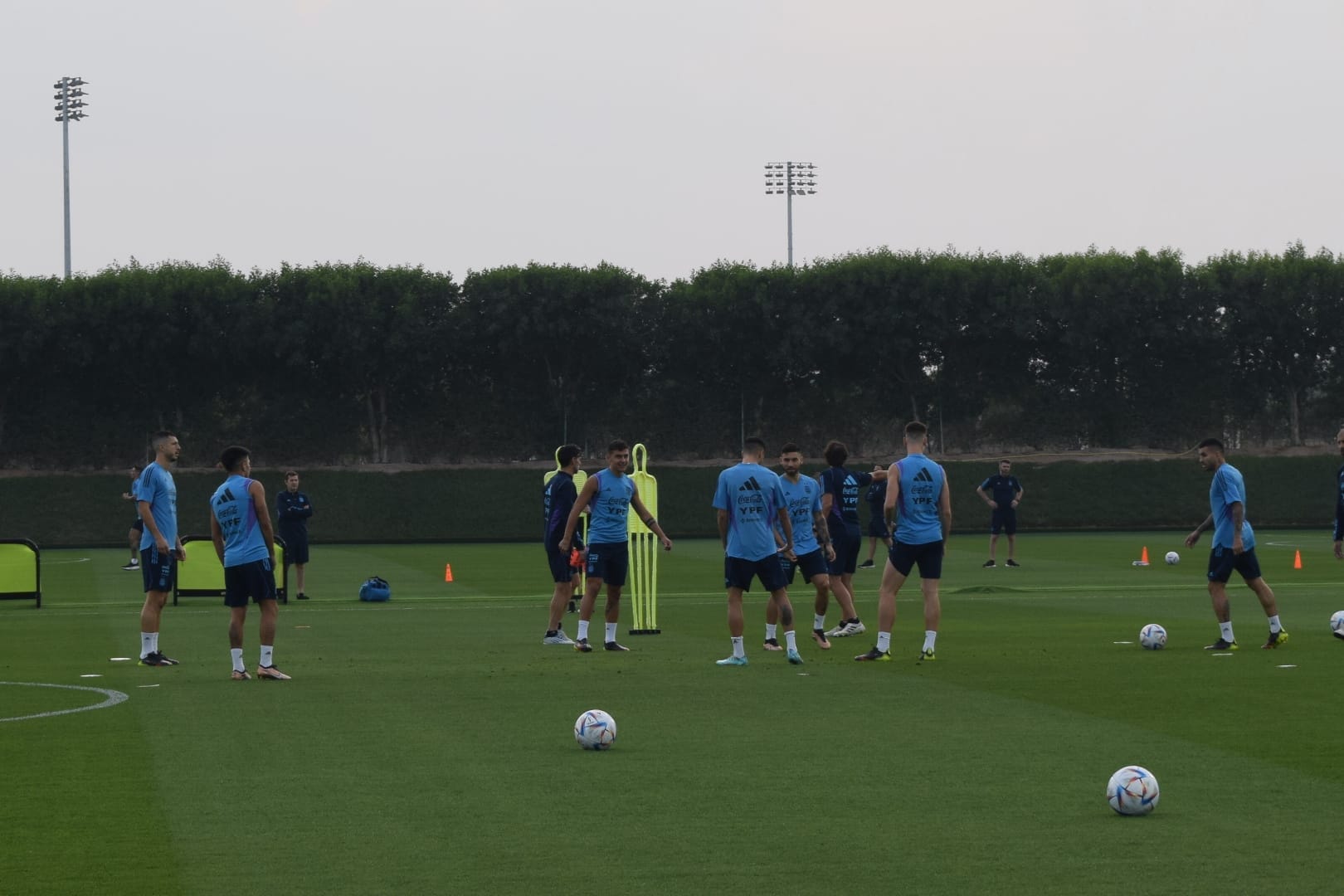 Los titulares de anoche solo hicieron bicicleta a un costado del terreno del entrenamiento de la Universidad de Qatar mientras que los arqueros se ubicaron en uno de los arcos para los movimientos correspondientes a la orden de los profes.