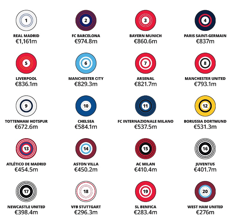 Real Madrid se encuentra en el primer lugar con 1.161 millones de euros de ingresos seguido por el Barcelona (974.8 millones) y el Bayern Munich (860.60 millones). PSG, Liverpool, Manchester City, Arsenal, Manchester United, Tottenham y Chelsea completan el ´top ten´ (ver infografía).