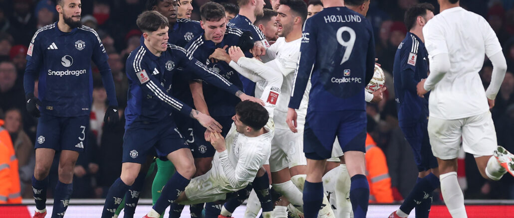 Durante el empate 1-1 en los noventa, hubo tumultos y peleas con el protagonismo de jugadores de ambos equipos en los que se distinguió Manuel Ugarte, del United, que le tiró un cabezazo a Kai Havertz tras una supuesta falta de Harry Maguire yprovocó un penal para el equipo de Ruben Amorim. La falla de Martin Ødegaard generó la reacción del propio uruguayo y Lisandro martínez con empujones y burlas al alemán por haber (supuestamente) fingido una infracción.