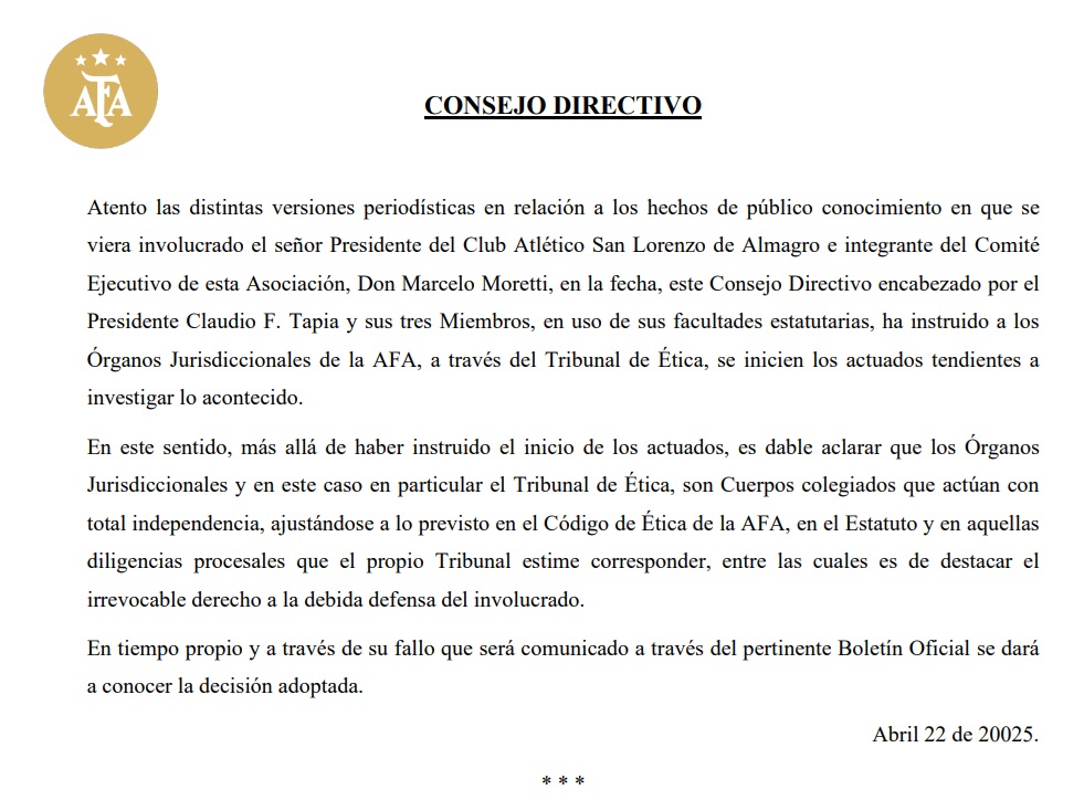 El comunicado fue emitido “Atento las distintas versiones periodísticas en relación a los hechos de público conocimiento en que se viera involucrado el señor Presidente del Club Atlético San Lorenzo de Almagro e integrante del Comité Ejecutivo de esta Asociación, Don Marcelo Moretti ”. Además, se destacó “el irrevocable derecho a la debida defensa del involucrado”.