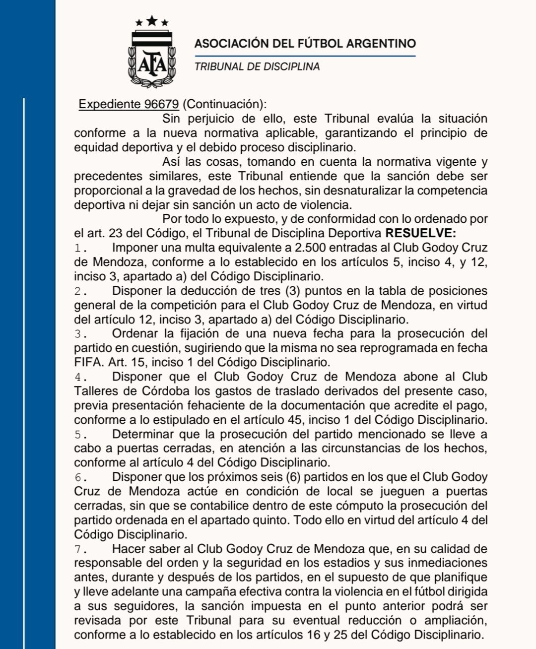 Por otro lado, también se dispuso que el partido reanudará para completar los minutos pendientes, con programación a definir, y con los gastos de la delegación visitante a cargo de Godoy Cruz.