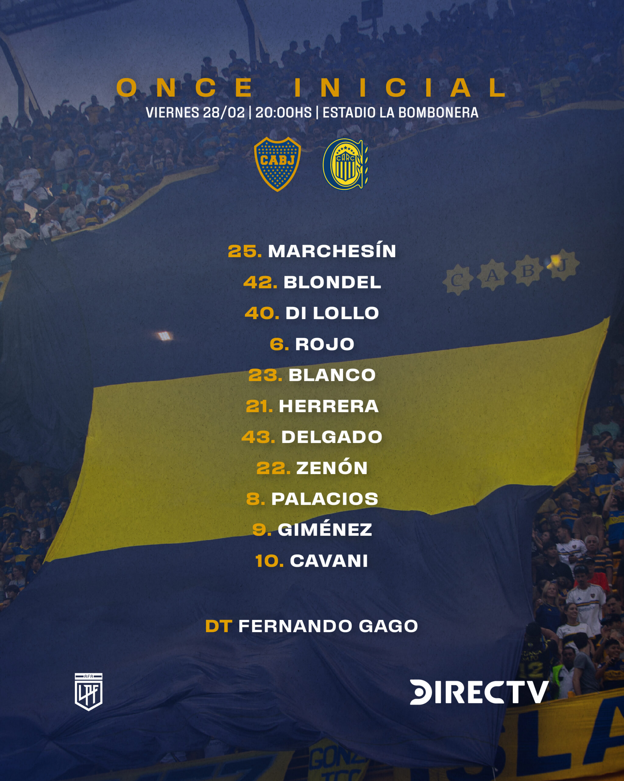 Respecto al once titular que plantó el martes por Copa Libertadores, el propio Gago hará algunas variantes. De esta forma ya se confirmó que Boca recibirá a Rosario Central con: Marchesín; Blondel, Di Lollo, Rojo, Blanco; Ander Herrera, Delgado, Zenón, Palacios; Milton Giménez y Cavani.