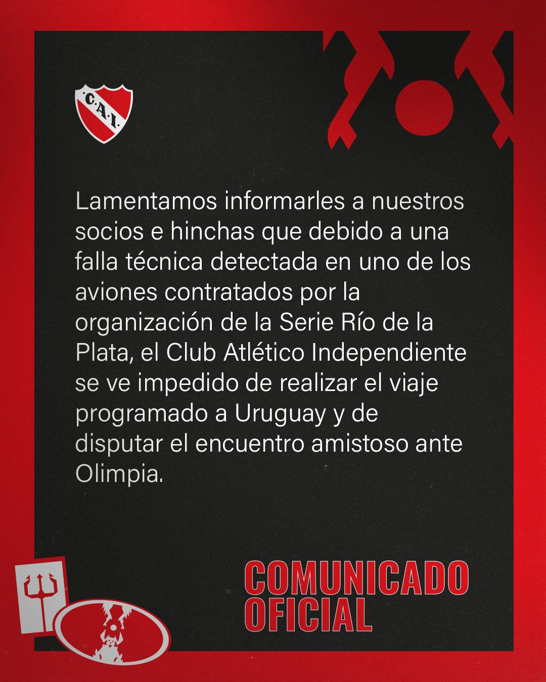 Este es el comunicado de Independiente donde anuncia la suspensión del encuentro