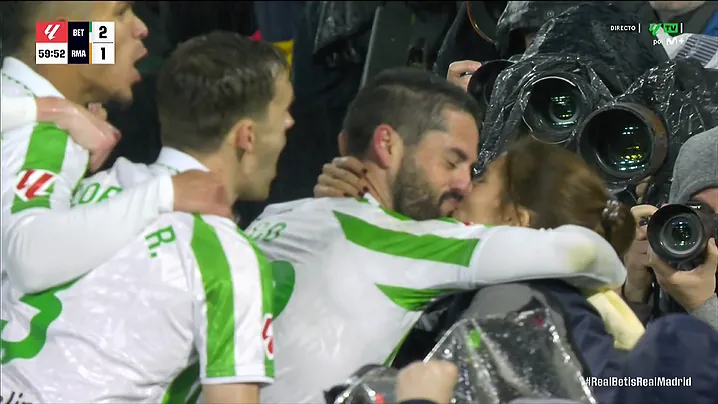 El mediocampista le metió el tanto a su ex equipo (Real Madrid) y salió disparado hacia el costado izquierdo de la cabecera del estadio Benito Villamarín en busca de su mujer. Sara Sálamo estaba esperando detrás de los carteles publicitarios y en la base de la tribuna y se topó con su marido que no tuvo otra idea que celebrar su gol con una escena romántica.