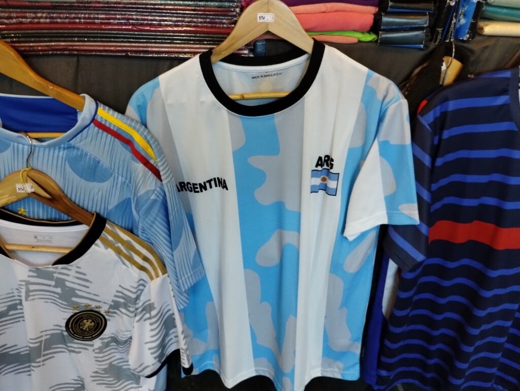 La calidad no es la mejor ni los modelos son demasiado atractivos pero sorprende la cantidad de modelos de camisetas de la Selección Argentina que abundan en el Soaq Waqif de Doha.