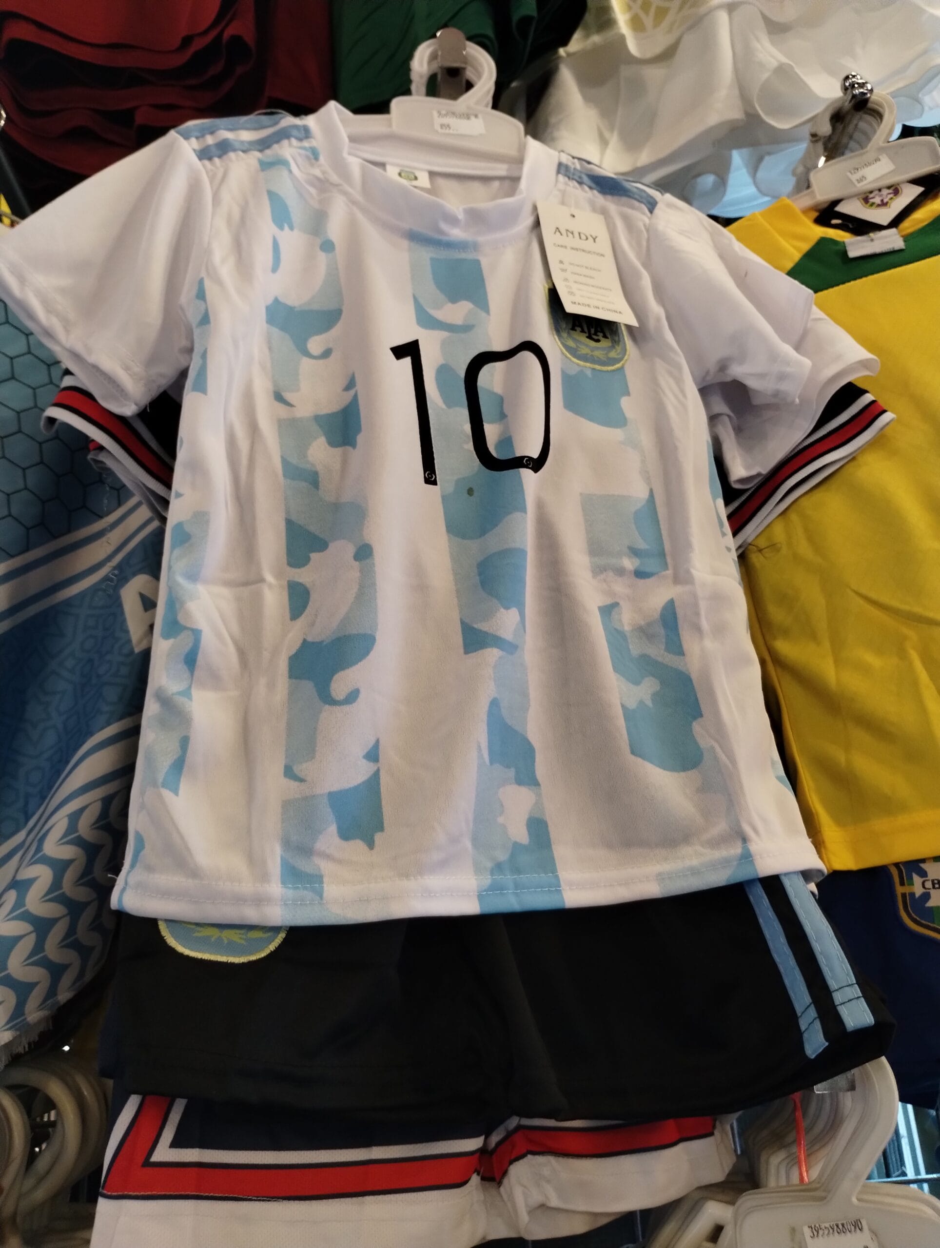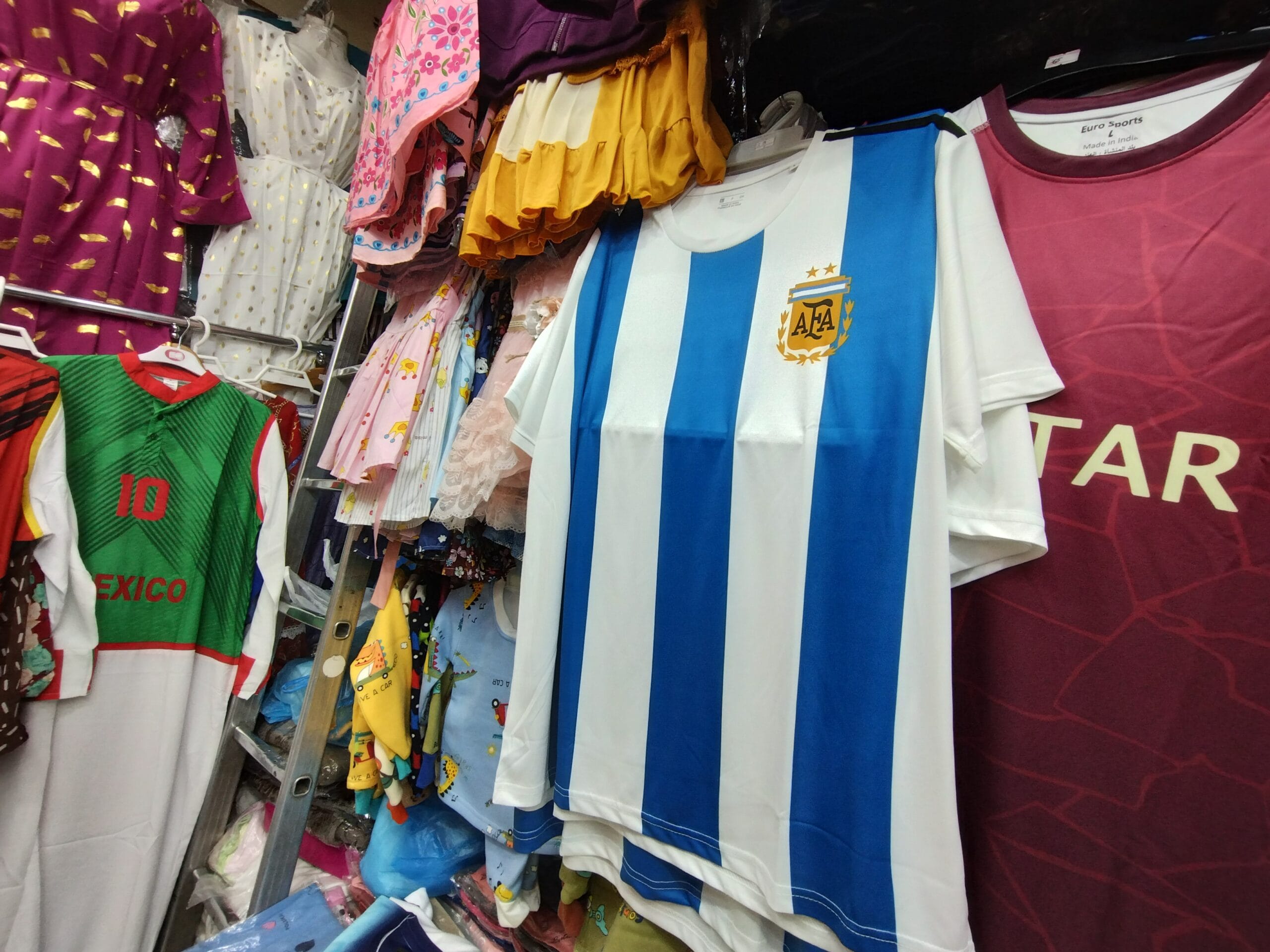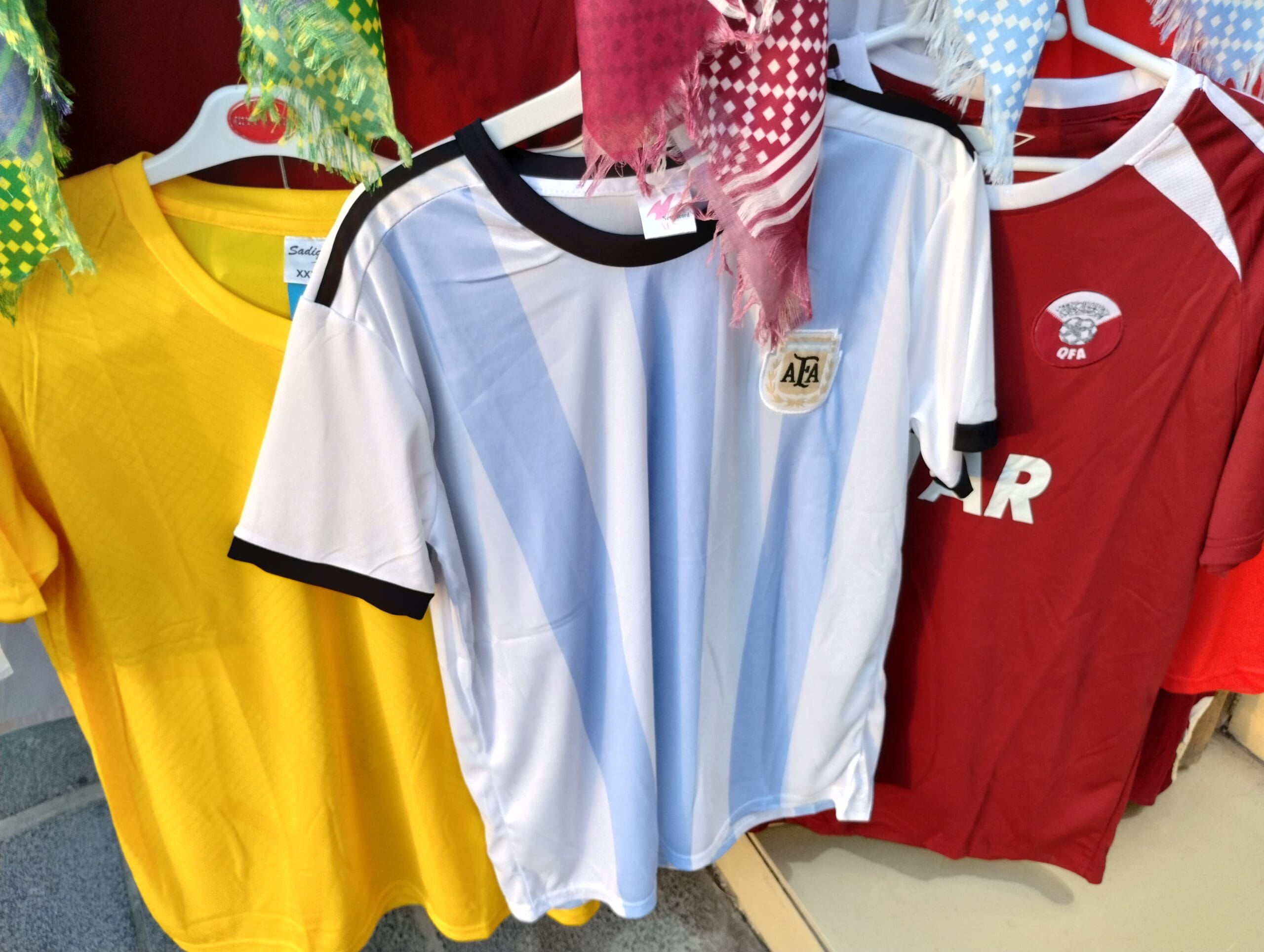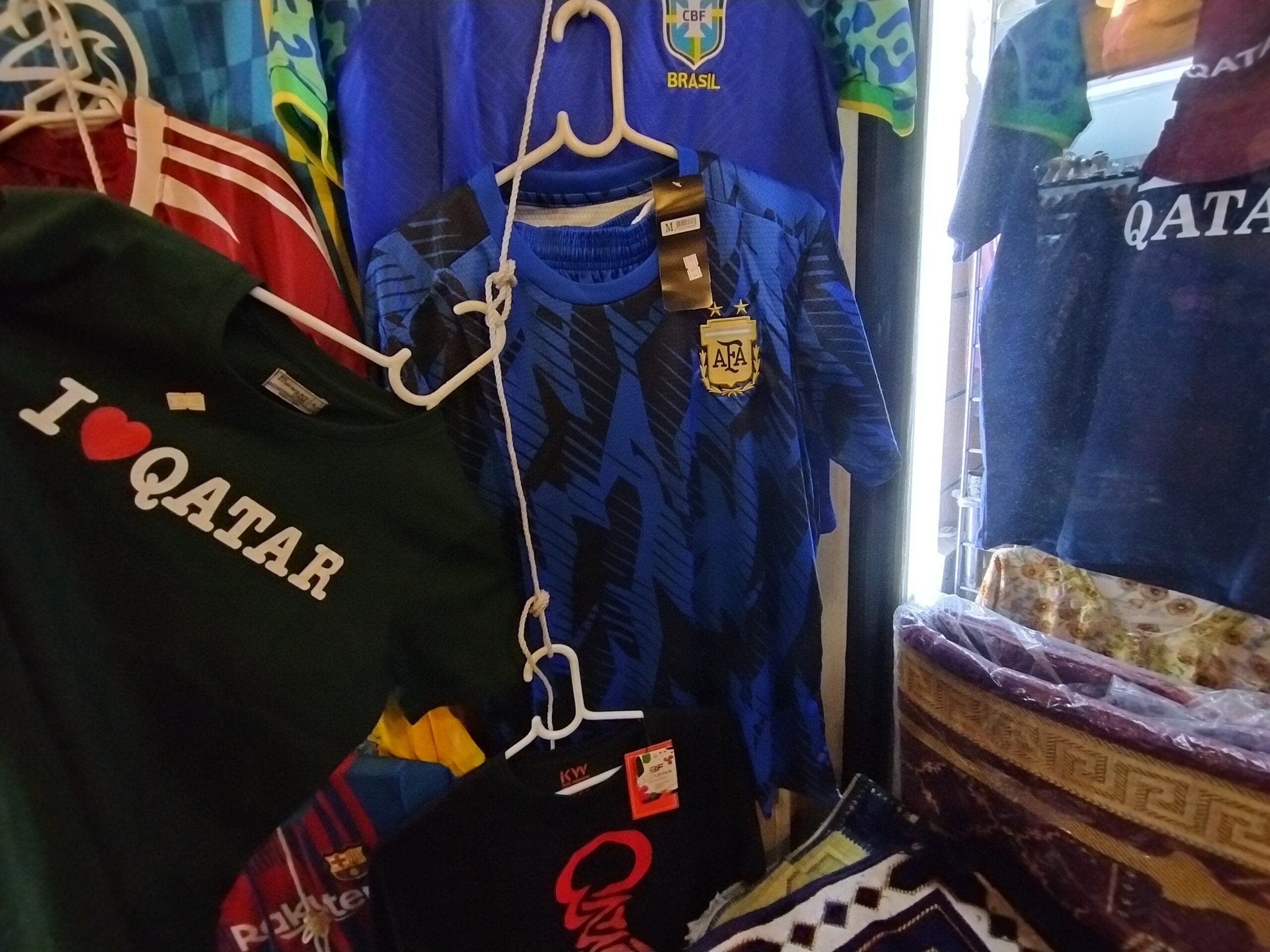La calidad no es la mejor ni los modelos son demasiado atractivos pero sorprende la cantidad de modelos de camisetas de la Selección Argentina que abundan en el Soaq Waqif de Doha.