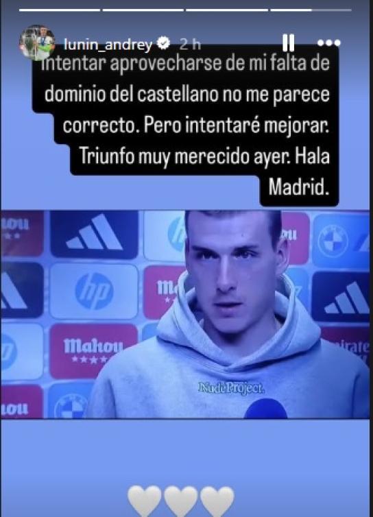Dado el revuelo que causaron sus declaraciones, Lunin decidió aclarar su postura a través de un posteo en Instagram. En dicho mensaje, el portero explicó: «Intentar aprovecharse de mi falta de dominio del castellano no me parece correcto, pero intentaré mejorar. Triunfo muy merecido ayer. ¡Hala Madrid!»