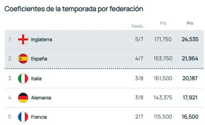Inglaterra llegó a un puntaje imposible de alcanzar tras la goleada de los Gunners en Londres e Italia, tercero en discordia, ya no puede igualar el coeficiente de los ingleses. Esto confirmó que la Premier League tendrá cinco pases a la Champions de la próxima temporada.