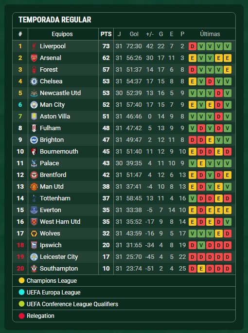 Claramente es una buena noticia para los equipos que vienen más relegados en los primeros puestos como Chelsea y Newcastle (quintos con 53 puntos), Manchester City (sexto con 52), Aston Villa (51) y Fulham (48).