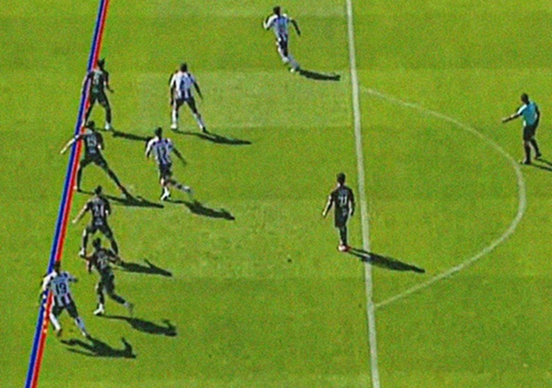 El VAR, dirigido por Germán Delfino, trazó líneas y la paralela azul, que indica la posición del último defensor, cruza el brazo y no el pie de apoyo.