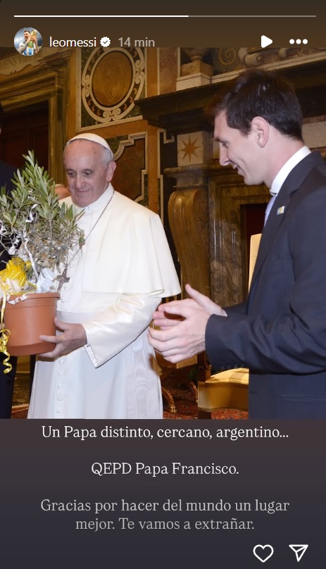 Lionel Andrés Messi escribió en su cuenta de Instagram: «Un Papa distinto, cercano, argentino. Que en paz descanse Francisco. Gracias por hacer del mundo un lugar mejor. Te vamos a extrañar» junto a una foto con el máximo referente de la religión católica.