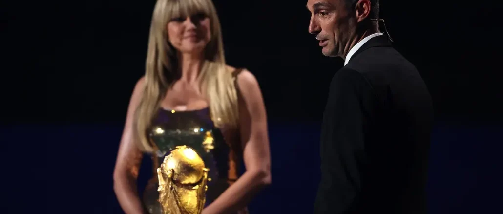 A pura elegancia y con guantes para sostener el trofeo, el técnico albiceleste entró a la ceremonia y colocó la Copa del Mundo en el atril para darle la bienvenida a la gala del sorteo del Mundial con las bolillas y la confección de los grupos de la competencia.