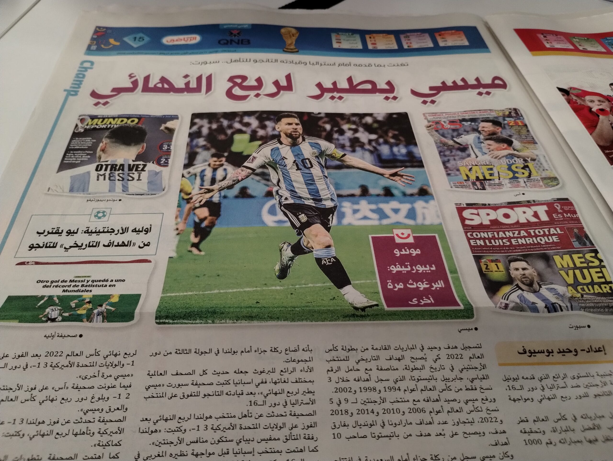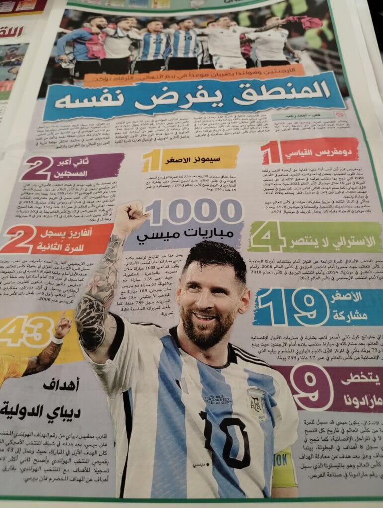 Los 1000 partidos de Lionel Messi también fueron un motivo fundamental para destacar en las líneas árabes de los periódicos de Qatar. ‘Leo’ jugó un partidazo y las páginas estuvieron bien ganadas al igual que la mención de las tapas internaciones con el rosarino como gran protagonista de la noche del estadio Ahmad Bin Ali.