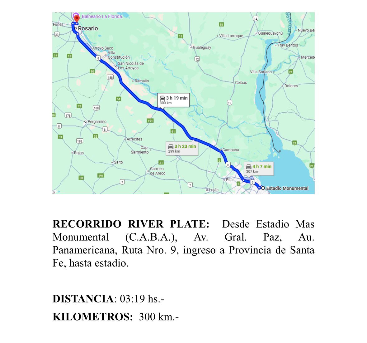 Por su parte, la parcialidad de River hará lo propio saliendo desde el Estadio Monumental (C.A.B.A.), toman Av. Gral. Paz, Autopista Panamericana, Ruta Nro. 9 con ingreso a Provincia de Santa Fe, hasta estadio.