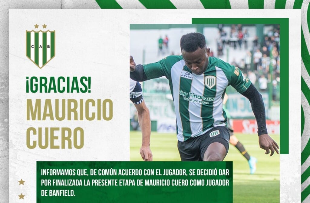 “Informamos que, de común acuerdo con el jugador, se decidió dar por finalizada la presente etapa de Mauricio Cuero como jugador de Banfield. Agradecemos a Mauricio por su profesionalismo y el compromiso con el que siempre defendió nuestros colores. Deseamos que tenga mucho éxito donde continúe se carrera. La Familia Banfileña le estará eternamente agradecida”, fue el mensaje del club.