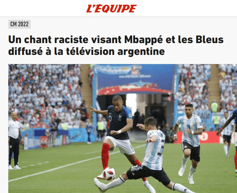 “Canto racista contra Kylian Mbappé y la Selección de Francia transmitido en vivo por la televisión argentina”, titula el sitio web de la radio pública France Info, señalando que el video viralizado superó las cuatro millones de reproducciones.