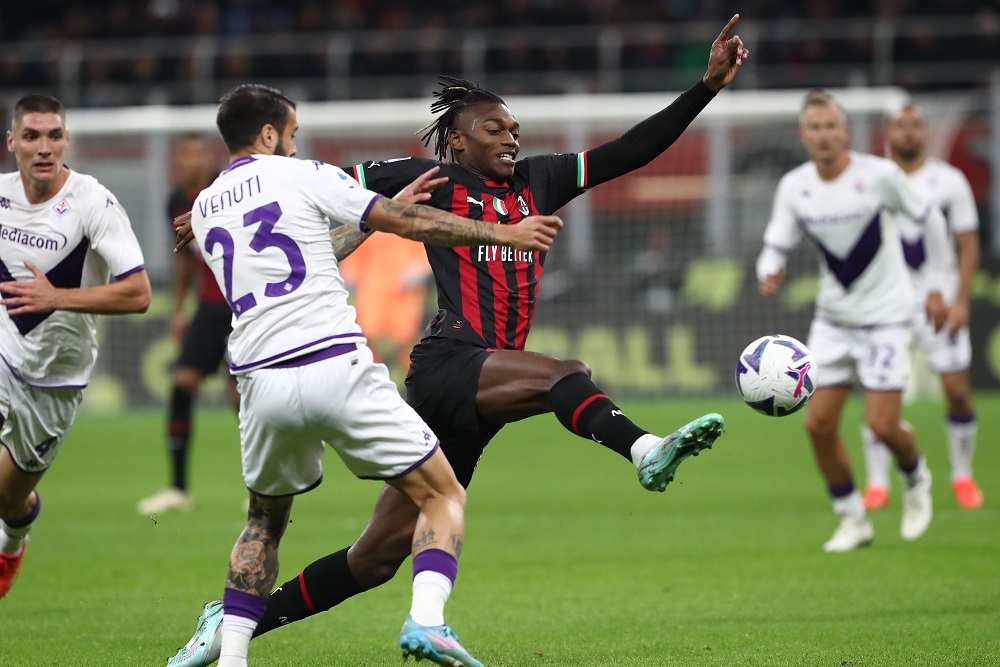 MILAN, ITALY - NOVEMBER 13: Rafael Leao (L) of AC Milan competes for the ball Lorenzo Venuti (R) of ACF Fiorentina during the Serie A match between AC Milan and ACF Fiorentina at Stadio Giuseppe Meazza on November 13, 2022 in Milan, Italy. (Photo by Marco Luzzani/Getty Images)