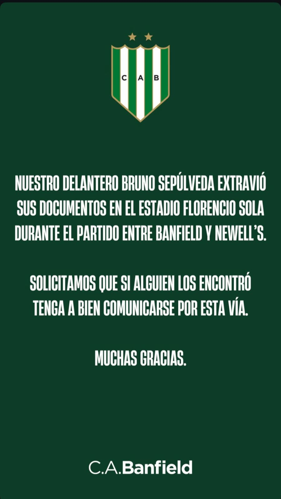 En su cuenta de Instagram, Banfield informó que el jugador Bruno Sepúlveda extravió sus documentos en el mismísimo Florencio Sola y al momento del encuentro ante la Lepra. A su vez, solicitan que si algún hincha los encontró, se comuniquen mediante esa red social para que el atacante pueda volver a tenerlos en su poder.