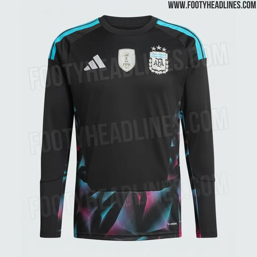 Según Footy Headlines, la nueva ropa que usará el Dibu Martínez en el Mundial 2026 tendrá una base negra con logotipos blancos, rayas de color celeste y un estampado azul y rosa con inspiración en la década del 90 en la parte inferior y los laterales.