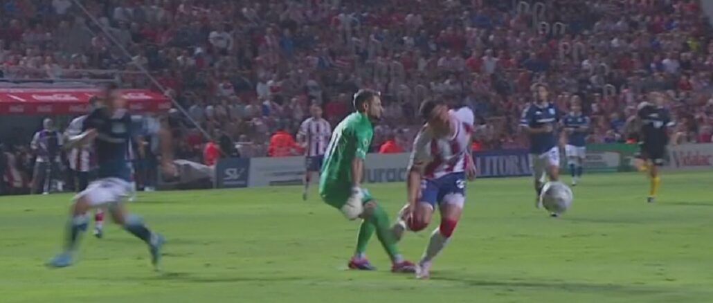 Luis Lobo Medina dejó seguir y luego revisó la acción mediante el VAR. Como último recurso, el arquero de la Selección de Chile vio la roja directa. Obligado a jugar con diez hombres, Gustavo Costas puso a Facundo Cambeses en lugar de Luciano Vietto. El ex Fulham de Inglaterra, ofuscado, se fue directo a los camarines.