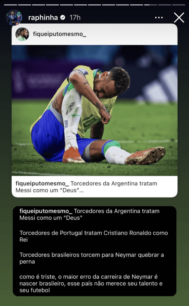 El mensaje fue compartido por el mismo Raphinhia, en las historias de su cuenta personal, compañero de Neymar en la convocatoria de Brasil para Qatar 2022.