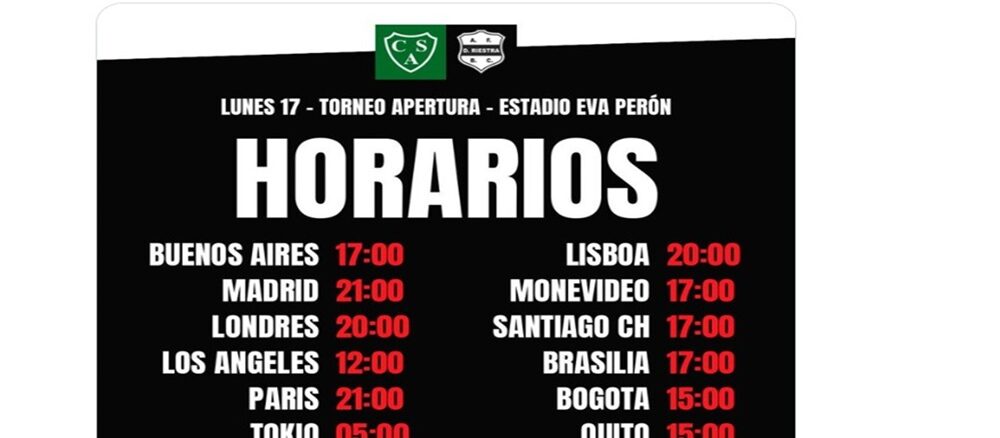 «¡Estés donde estés, no te podés perder el Sarmiento – Riestra de hoy!» sentenció la cuenta de X y de Instagram de los Malevos de Pompeya. Así, el cotejo que se jugará a las 5 de la tarde en Junín, comenzará por ejemplo a las 9 de la noche en París, o a las 8 en Londres.