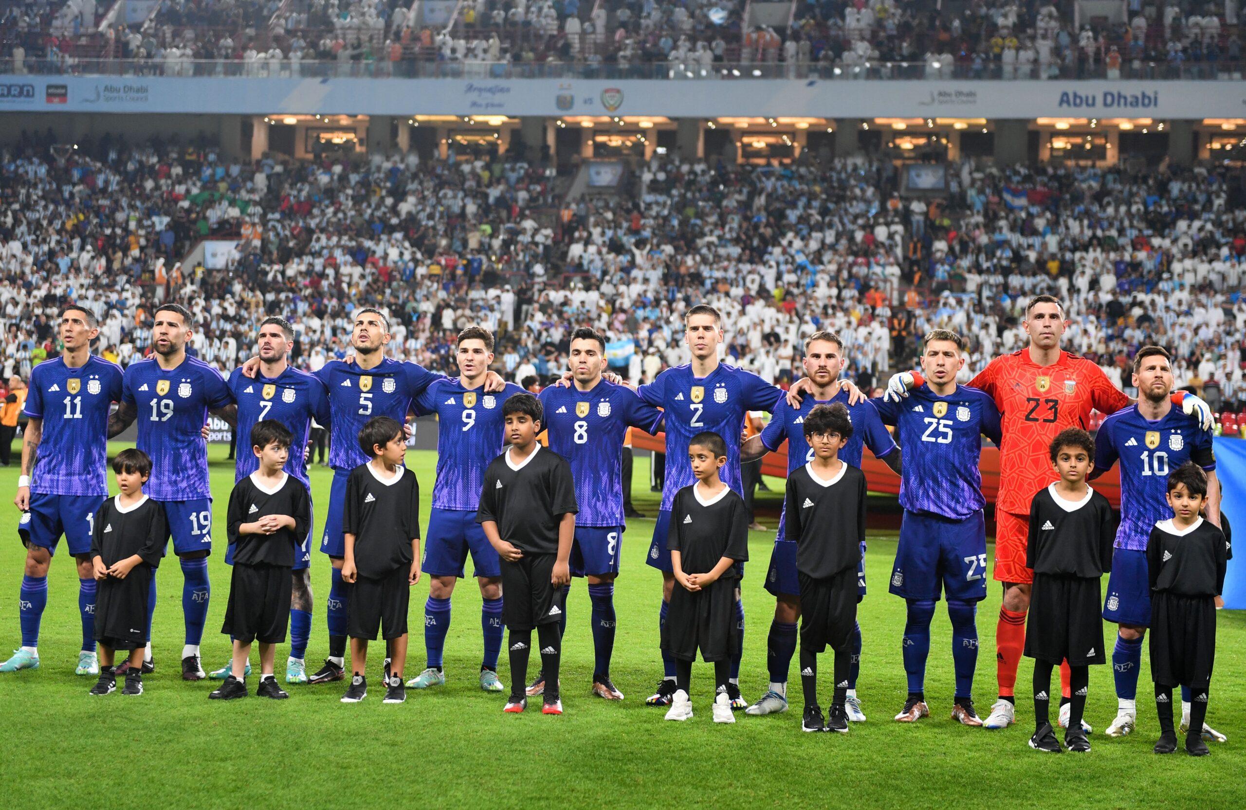 UAE's midfielder Abdalla Ramadan Bekheet (R) and Argentina's midfielder Rodrigo de Paul vie for the ball during the friendly football match between Argentina and the United Arab Emirates at the Mohammed Bin Zayed Stadium in Abu Dhabi, on November 16, 2022. (Photo by Ryan LIM / AFP) (Photo by RYAN LIM/AFP via Getty Images)