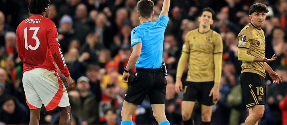Real Sociedad busca soluciones y Aramburu le trajo problemas. El defensor intentó cerrar la carrera de Patrick Dorgu y le terminó cometiendo infracción de último hombre, por lo que el juez Benoit y no dudó en expulsar.