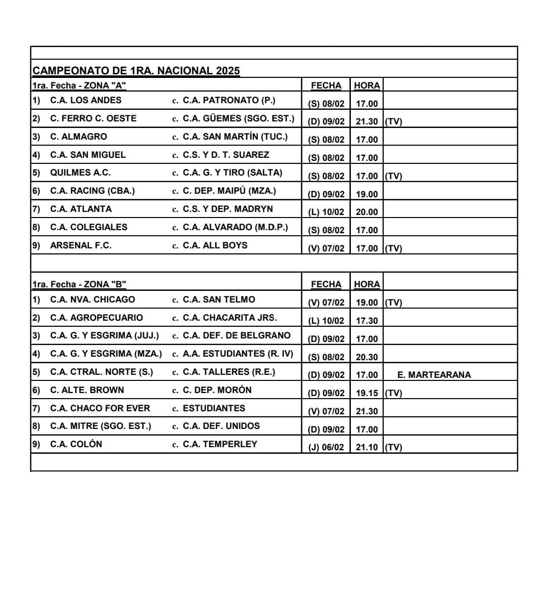 La Asociación del Fútbol Argentino definió los días y horarios de la primera fecha de la Primera Nacional que comenzará el jueves 6 de febrero con la presentación de Colon y Temperley en Santa Fe (será televisado) y finalizará el lunes 10 con Atlanta y el Deportivo Madryn.