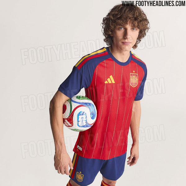 Según Footy Headlines, la camiseta titular de la Selección de Luis De la Fuente tendrá un fondo de rojo furioso con unas líneas finas de amarillo y las mangas azules con las tres tiras de Adidas combinando ambos colores y llegando hasta los hombros.