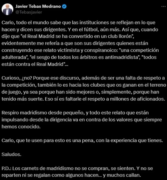 «Cuando dije que «el Real Madrid se ha convertido en un club llorón», evidentemente me refería a que son sus dirigentes quienes están construyendo ese relato victimista y conspiranoico: «una competición adulterada», «el sesgo de todos los árbitros es antimadridista», «todos están contra el Real Madrid»…», comenzó el presidente de La Liga en sus palabras en el tuit.