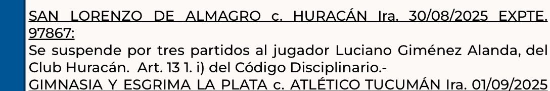 Días después salió el Tribunal de Disciplina de la AFA y salió la fuerte sanción para el ex delantero de Estudiantes que recibió tres fechas de suspensión. Así se perderá los partido con Vélez, Racing e Independiente Rivadavia. Se había ganado el puesto en la consideración de Frank Darío Kudelka por algunas buenas actuaciones pero ahora perderá terreno en la pelea con Eric Ramírez y Matías Tissera.