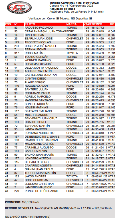 Ardusso sacaba a relucir todo el funcionamiento de su “Toro” y fue por la punta. En la vuelta 21 lo buscó por afuera al líder y este no le dejó el lugar suficiente. Por este motivo, Catalán Magni recibió un llamado de atención por parte de los comisarios deportivos y en la siguiente vuelta “El Flaco” de Las Parejas tuvo su revancha. Estaba puntero de una electrizante competencia.